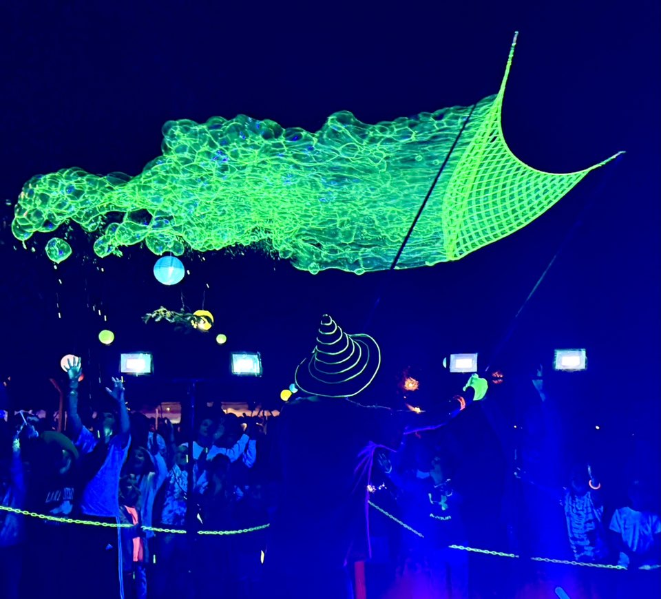 A mesmerizing display of art in motion. UV floodlights light up my special bubble solution to create vibrant colors. All ingredients are safe and biodegradable.